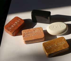 Lately, I’ve been reflecting on time and the ability of stone to preserve it, capture it, bear witness to it. In this regard, I recently completed “A mano a mano“, an installation composed of seven marble soaps, each engraved with a word that refers to what we would like to wash our hands of because it is too painful, too shameful, too unbearable. Sometimes even just to defend a small shred of happiness besieged by the tragedies of others. However, what we wish to erase today like soap, with the passage of time becomes marble in our memory and consciousness. Today is the time when we can act, feel, and look as witnesses, without turning our heads, both in the face of small individual tragedies and in the face of collective tragedies. The seven soaps, one for each day of the week – almost as if renewing the daily ritual of a different forgetfulness – are made of precious marble in pastel colors and are intended to resemble in every way the scented soaps we bring home from a trip to the French Riviera or buy at the local supermarket. But they carry significant weight and indelible inscriptions. Where much of our present is written on luminous screens, stone remains a guarantee of eternity.