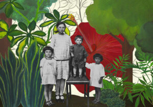 Perhaps because at that time I was experiencing firsthand the conflict between the desire to move elsewhere and the personal issues that prevented me from doing it, and I identified with the one who stayed home. With a rusting desire, imagining the others in who knows what exotic worlds. Thus was born a cage-boat whose mainmast has living roots. A sort of lowercase monument dedicated to those who remain, in which the instinct to travel and the fear of cutting off one’s roots coexist crystallized. The collages, on the other hand, were born from a fascination with the use of painted backdrops in early photography. As I mentioned before, identifying with the one who remains, I imagined those who had left living in exaggeratedly exotic, almost psychedelic worlds. So I painted backdrops myself on which to display the photographs, recovered from the municipal archive, of those who had left.