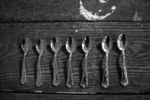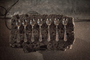 The work was born as part of the project “L’ultimo appartamento” that I created with two other artists and a curator, in which we were asked to stage an exhibition in a disused apartment. It was December 2021 and, seeing this cold, abandoned apartment, we imagined to describe it as if it were the last refuge before the apocalypse. The works were mixed with real objects and furniture, with which we recreated the feeling of a long-abandoned house, almost like a wreck found by chance. Creators and archaeologists at the same time. In this setting, the teaspoons found even more meaning: they were placed in an orderly row and glistened on an old wooden table in what was once the kitchen. There I took the photograph you find in “Sette sott’acqua.” The idea of the words remaining after a traumatic experiences comes from a text I loved very much by the author Georgy Gospodinov, “The Phiyics of Sorrow”, in which a character returns from the war with, as his only loot, seven words in Hungarian. So I asked myself what seven words I would take with me as loot for a new world, as a legacy of what has been. It wasn’t easy to choose them, and they don’t claim to be exhaustive. I looked for words that belong to different grammatical categories (abstract nouns, concrete nouns, common nouns, proper nouns, verbs, interjections, etc.) and which relate to different sensory areas: