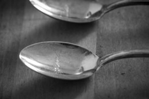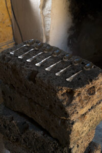 L’opera nasce nell’ambito del progetto “L’ultimo appartamento” che ho realizzato con altri due artisti e una curatrice, in cui ci è stato chiesto di realizzare una mostra in un appartamento dismesso. Era il dicembre 2021 e, vedendo questo appartamento freddo e abbandonato, abbiamo immaginato di raccontarlo come se fosse l’ultimo rifugio prima dell’apocalisse. Le opere si mescolavano a oggetti veri e mobili con cui abbiamo ricreato il senso di una casa abbandonata da tempo, quasi un relitto trovato per caso. Creatori e archeologi al tempo stesso. In questa cornice i cucchiaini trovavano ancora più senso: stavano appoggiati in fila ordinata e luccicavano su un vecchio tavolo di legno messo in quella che era la cucina. Lì ho scattato la fotografia che trovate in “Sette sott’acqua”. L’idea delle parole che restano dopo esperienze traumatiche mi viene da un testo che ho molto amato dell’autore Georgy Gospodinov “Fisica della malinconia”, in cui un personaggio torna dalla guerra con, come unico bottino, sette parole in ungherese. Mi sono quindi chiesta quali fossero la sette parole che io porterei con me come bottino per un mondo nuovo, come eredità di quello che è stato. Non è stato facile sceglierle, e non hanno la pretesa di essere esaustive. Ho cercato parole che appartengano a categorie grammaticali diverse (nomi astratti, nomi concreti, nomi comuni, nomi propri, verbi, interiezioni, ecc.) e che afferiscano ad aree sensoriali differenti: